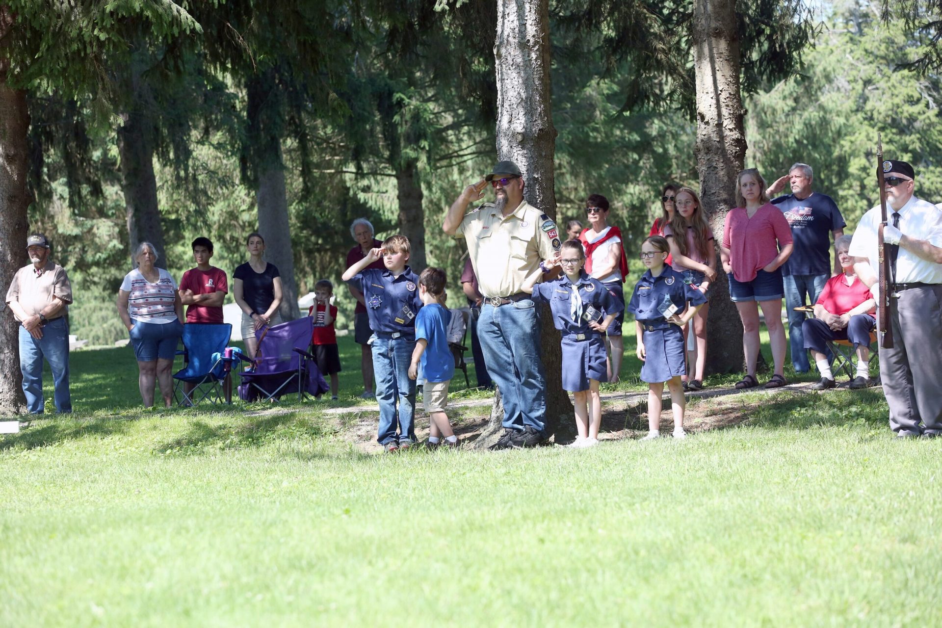 People salute and stand respectfully during the raising of the flag to the top of the staff during the Memorial Day ceremony held by the Veterans Memorial at the Moravian Cemetery in Hope, Indiana, Monday, May 30, 2022 Carla Clark | For The Republic