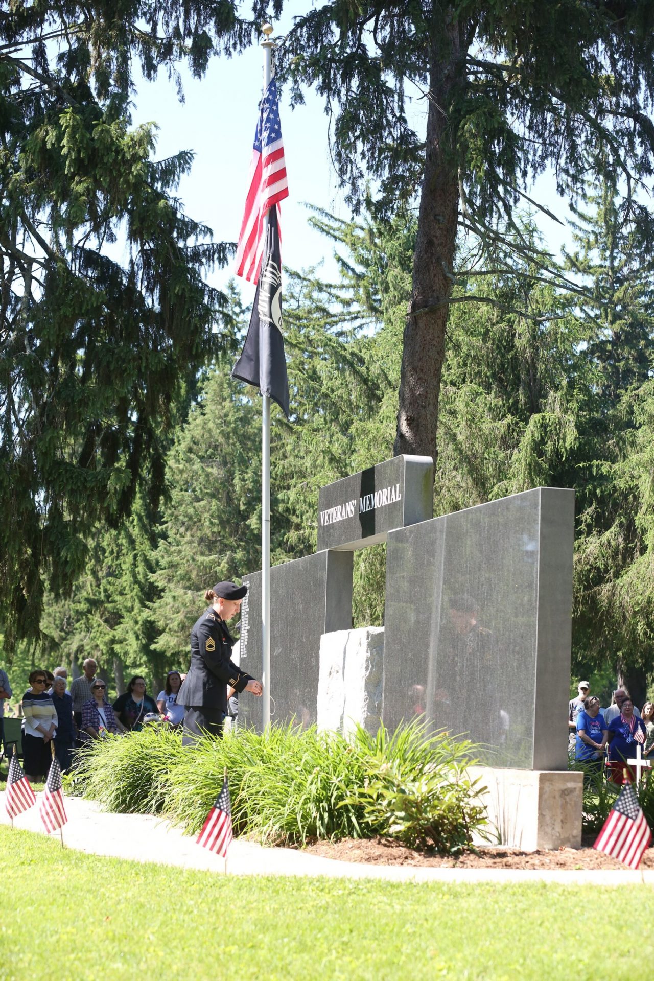 Sgt. 1st Class Brandi Kammel raises the flag to the top of the staff during the Memorial Day ceremony held by the Veterans Memorial at the Moravian Cemetery in Hope, Indiana, Monday, May 30, 2022 Carla Clark | For The Republic