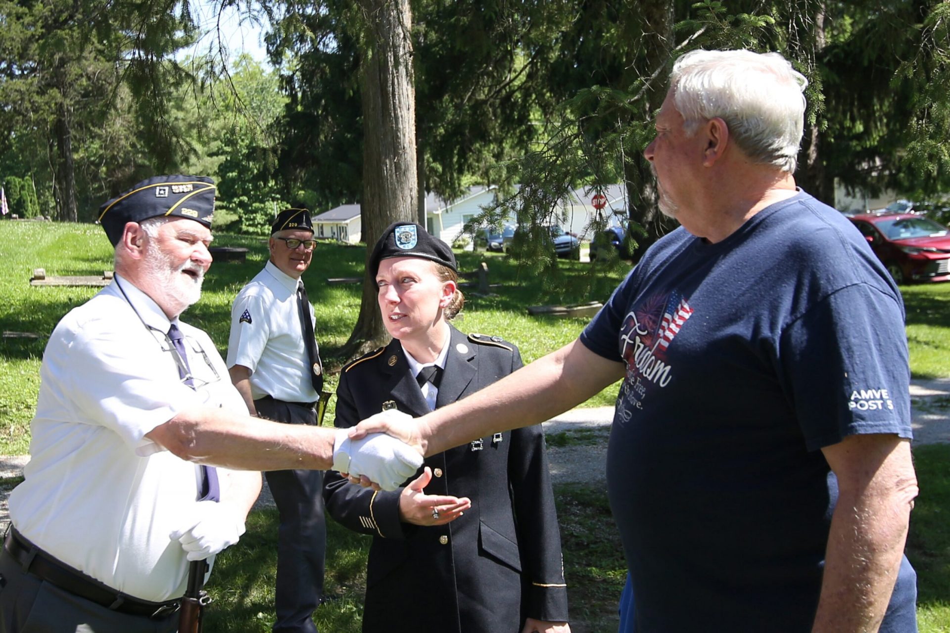 Marty Kildren and Roger Burke shake hands as Roger's daughter, Sgt. 1st Class Brandi Kammel, looks on during the Memorial Day ceremony held by the Veterans Memorial at the Moravian Cemetery in Hope, Indiana, Monday, May 30, 2022 Carla Clark | For The Republic