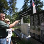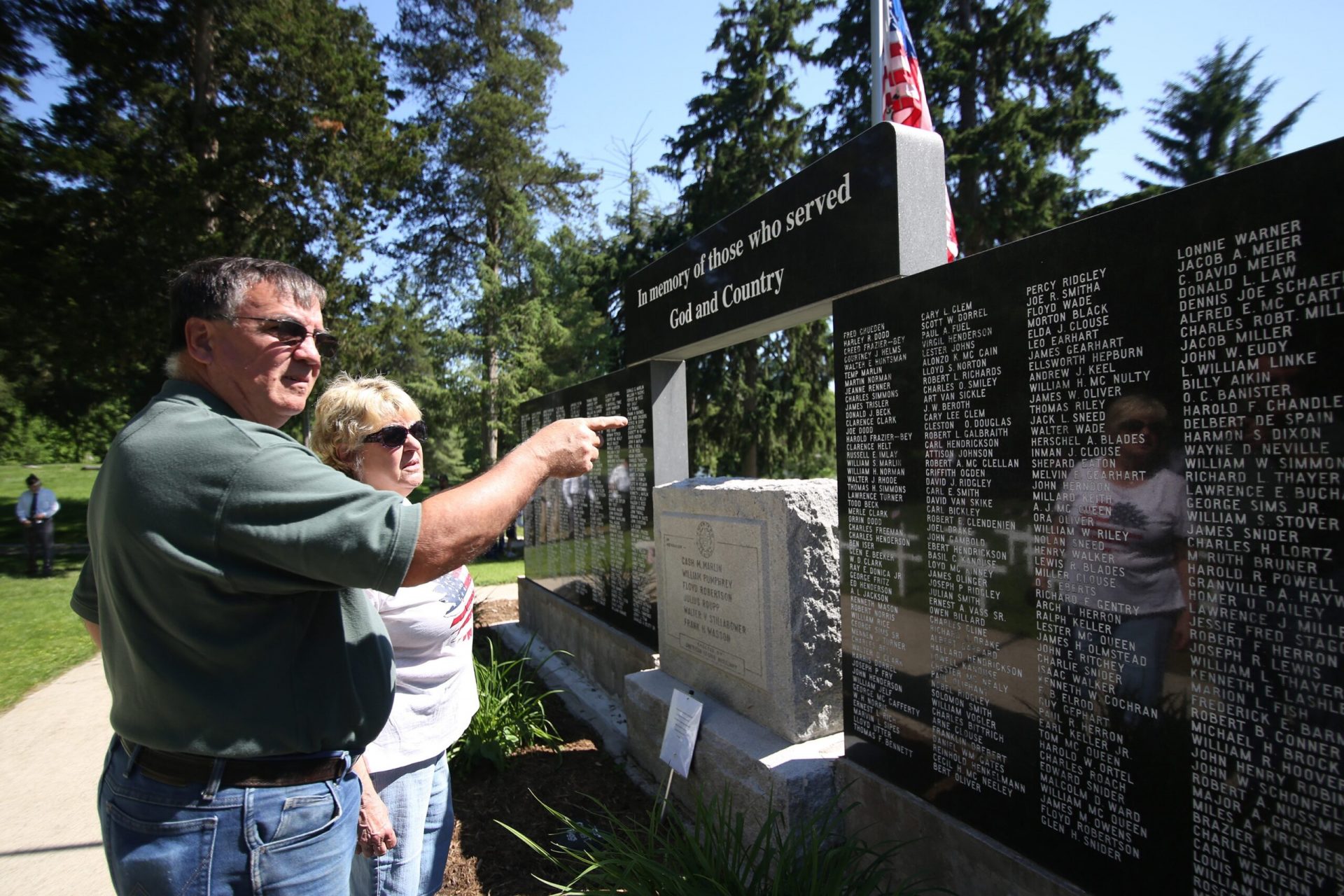 Mark Thayer and Margie Thayer Boilanger look for names of family members during the Memorial Day ceremony held by the Veterans Memorial at the Moravian Cemetery in Hope, Indiana, Monday, May 30, 2022 Carla Clark | For The Republic