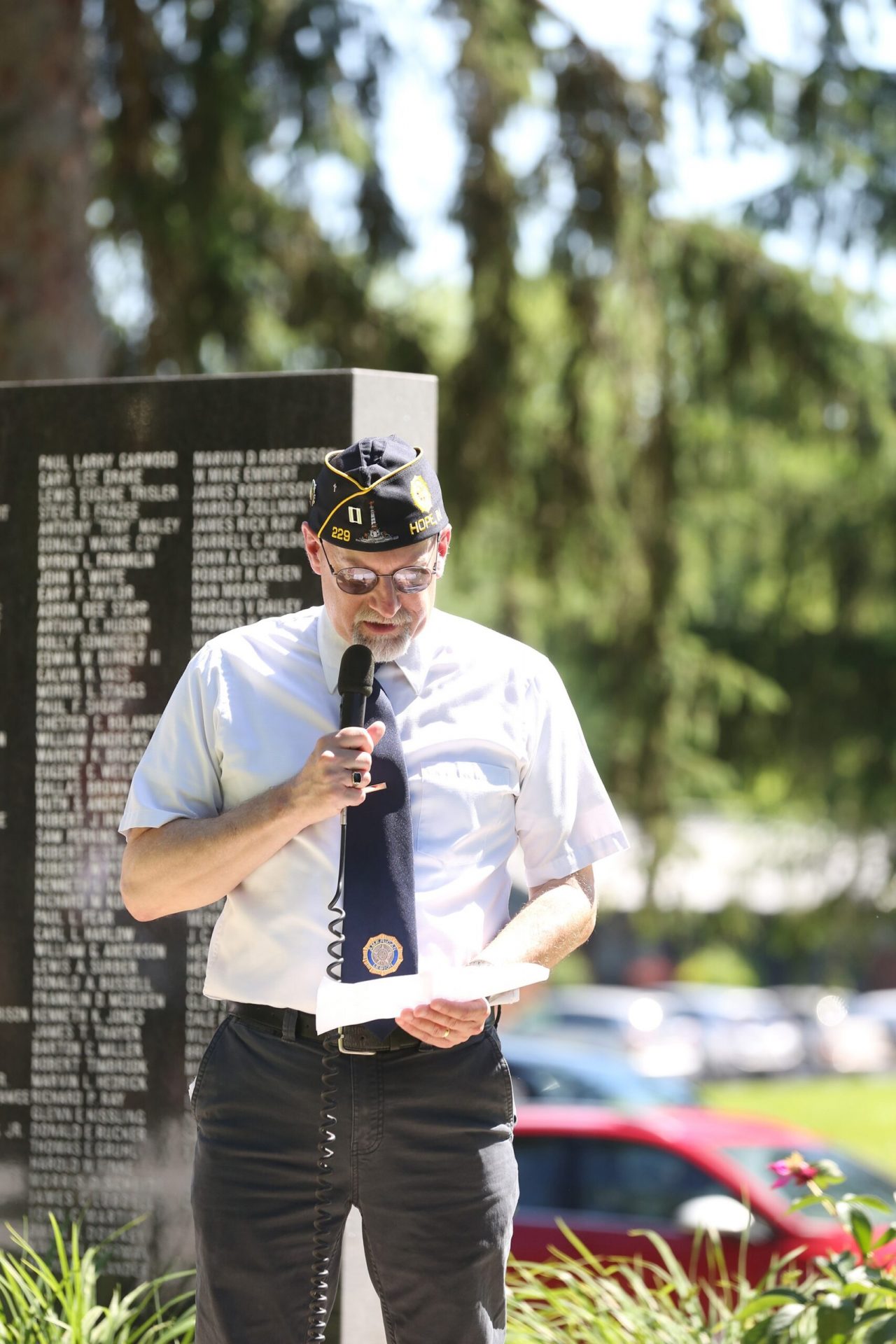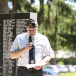 David Compton listens as Larry Wheeler gives the numbers lost during wars at the Memorial Day ceremony held by the Veterans Memorial at the Moravian Cemetery in Hope, Indiana, Monday, May 30, 2022 Carla Clark | For The Republic
