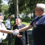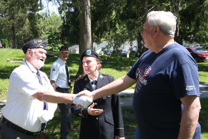 Marty Kildren and Roger Burke shake hands as Roger’s daughter, Sgt. 1st Class Brandi Kammel, looks on during the Memorial Day ceremony held by the Veterans Memorial at the Moravian Cemetery in Hope, Indiana, Monday, May 30, 2022 Carla Clark | For The Republic