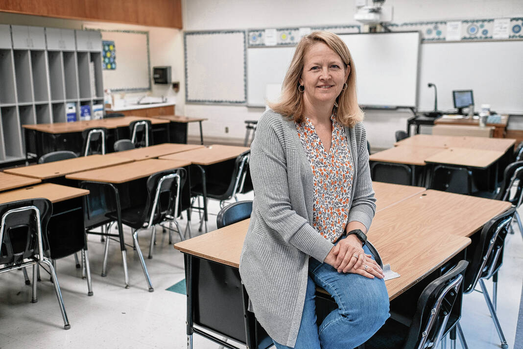 Mike Wolanin | The Republic Fifth grade teacher Amy Elsbury poses for a portrait in her classroom at Rockcreek Elementary School in Columbus, Ind., Monday, May 23, 2022. Elsbury was recently named as recipient of the William and Sally Hanley Excellence in Teaching Award. The award is administered by the Heritage Fund.