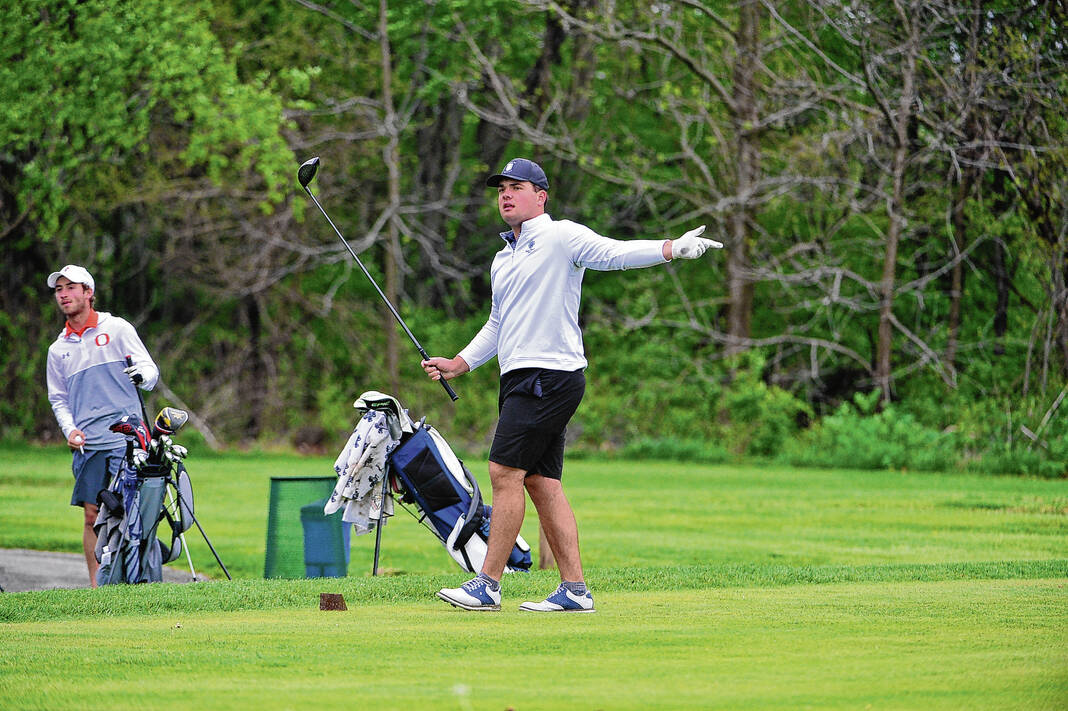 Columbus North’s Willy Davis reacts to his drive on No. 9 during a match against Columbus East May 4 at Otter Creek Golf Course.