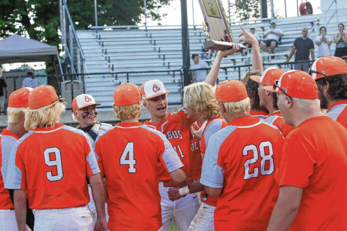 Columbus East’s Ethan Ianni (11) holds up the regional championship trophy after the Olympians beat New Albany 3-2 in the regional final June 4 at Jasper.