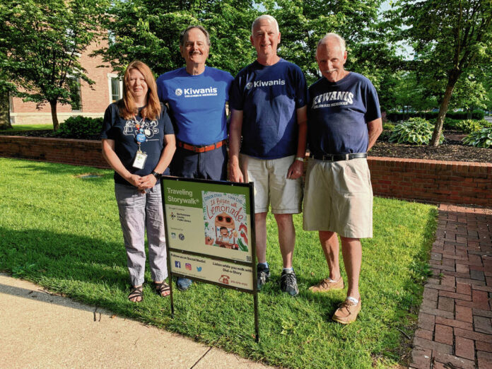 Photo provided Meridian Kiwanis members Sandy Allman (also a Bartholomew County Public Library Outreach librarian), club President Doug Stender, Jeff Blasdel and John Asel are shown with the sign for the Traveling StoryWalk, currently at the Columbus Visitor’s Center downtown.