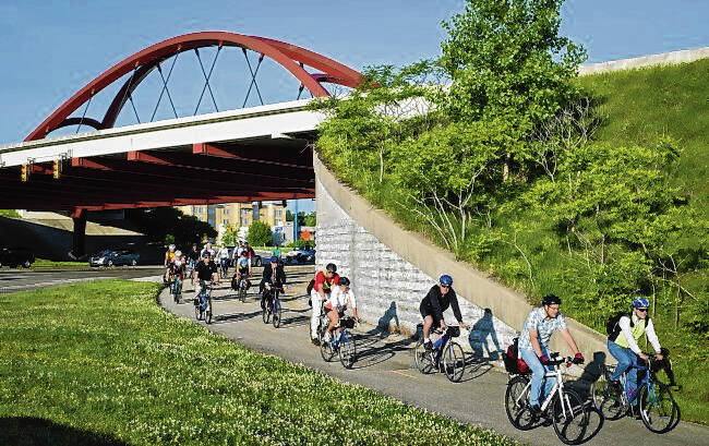 Republic file photo Bicyclists pedal to downtown Columbus on the People Trail near the Front Door Bridge during the annual Bike To Work Day, Friday, June 6, 2014.