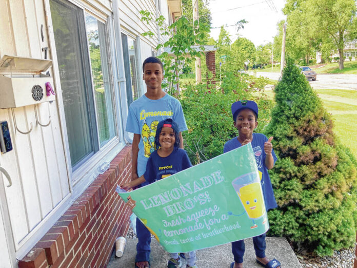 Jana Wiersema | The Republic Kimale Freeman, left-right, Jacob Jones and Junior Jones hold a sign for the lemonade stand they are using to give back to the community.