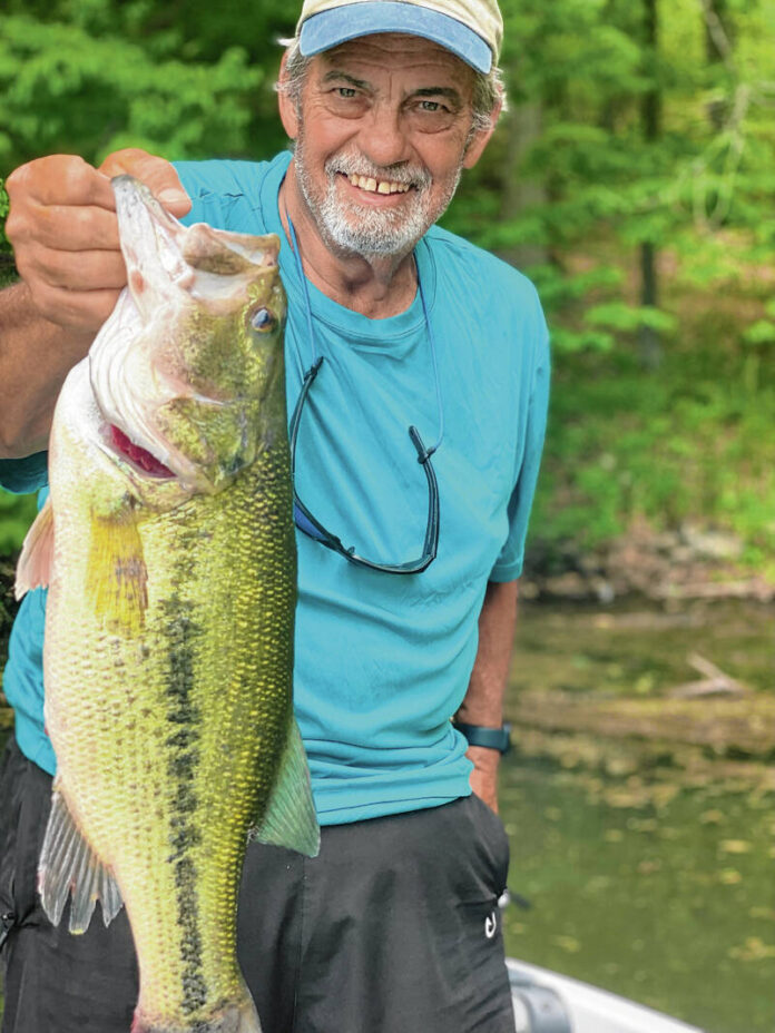 We began fishing jigs on points in about 15 to 20 feet of water. Big Ed would move around until he found fish on his sonar, then we’d set up to work the point. On one particular spot, we caught two bass about 3 pounds each and one pushing 5. I was really impressed by the luck, but Big Ed didn’t think it was so special. He said the lake consistently produces bursts like that. When you find them and put what they want down there in front of them, you can catch some big ones fast. We were done fishing at 11 a.m.