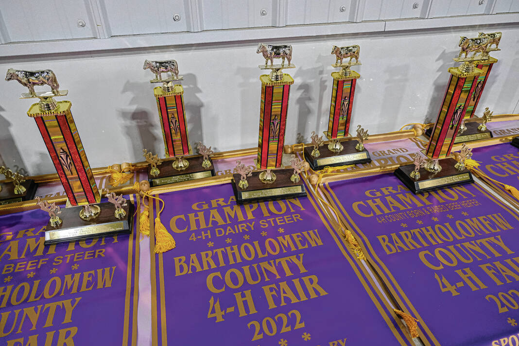 Mike Wolanin | The Republic A view of grand champion banners and trophies on a table for the beef and dairy shows during the Bartholomew County 4-H Fair at the Bartholomew County 4-H Fairgrounds in Columbus, Ind., Thursday, June 30, 2022.