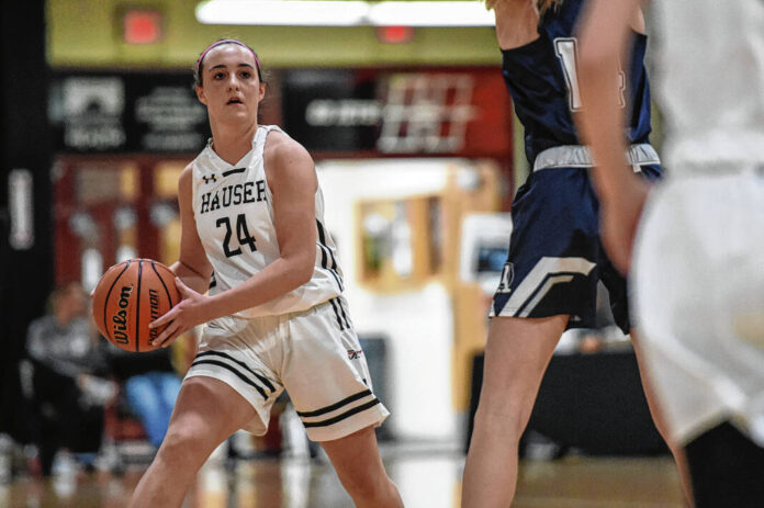 Hauser’s Madelyn Poe sets up to pass the ball during a basketball game between Hauser and Oldenburg Academy at Hauser Jr./Sr. High School in Hope, Ind., Tuesday, Jan. 11, 2022.