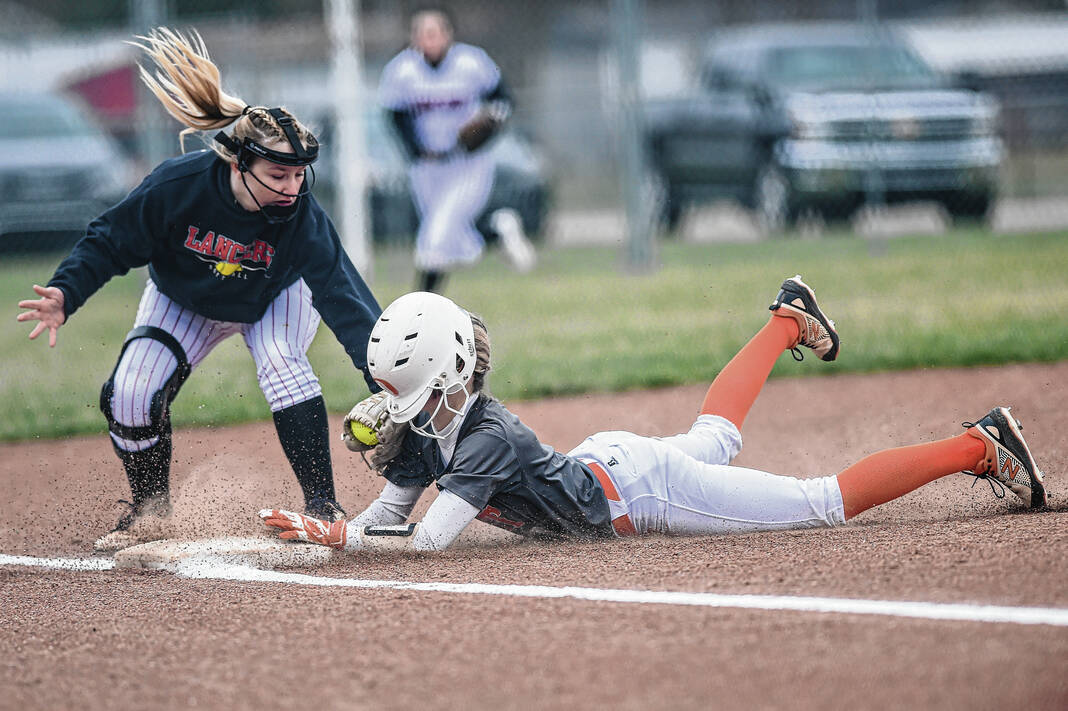 Columbus East’s Kenzie Foster, right, beats a tag by Edinburgh third baseman Alix Streeval during a softball game at the Steve Hollenbeck Athletic Complex in Edinburgh, Ind., Tuesday, March 29, 2022.