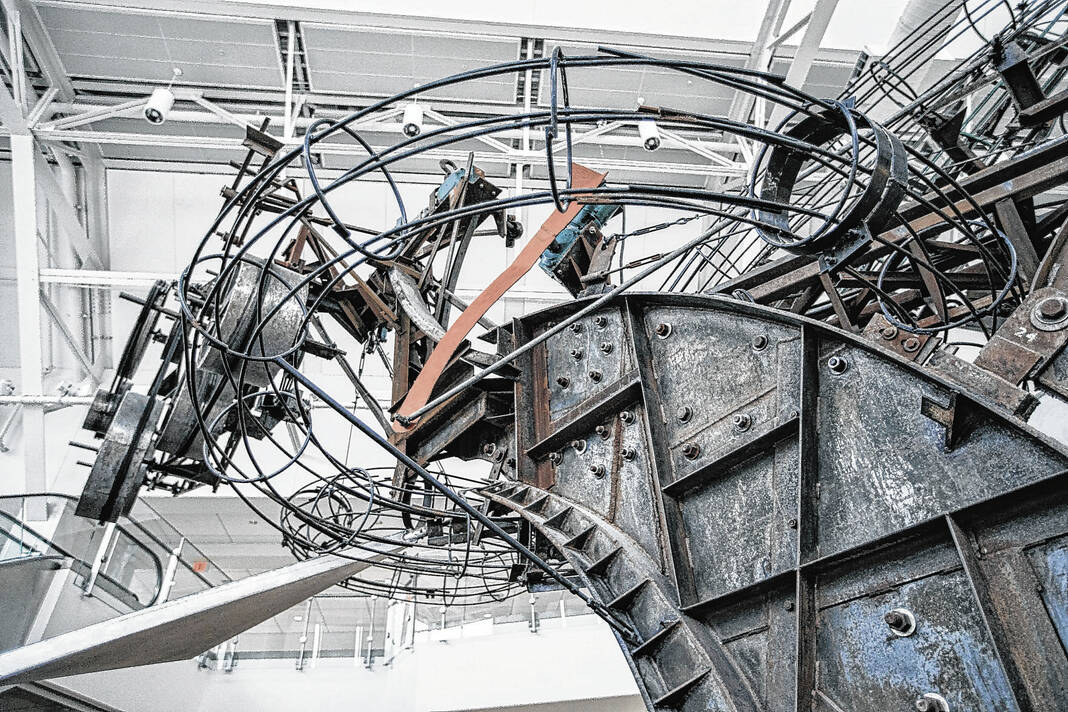 Mike Wolanin | The Republic A view of the Chaos I kinetic sculpture by Swiss artist Jean Tinguely in The Commons in Columbus, Ind., pictured Thursday, Feb. 28, 2019.