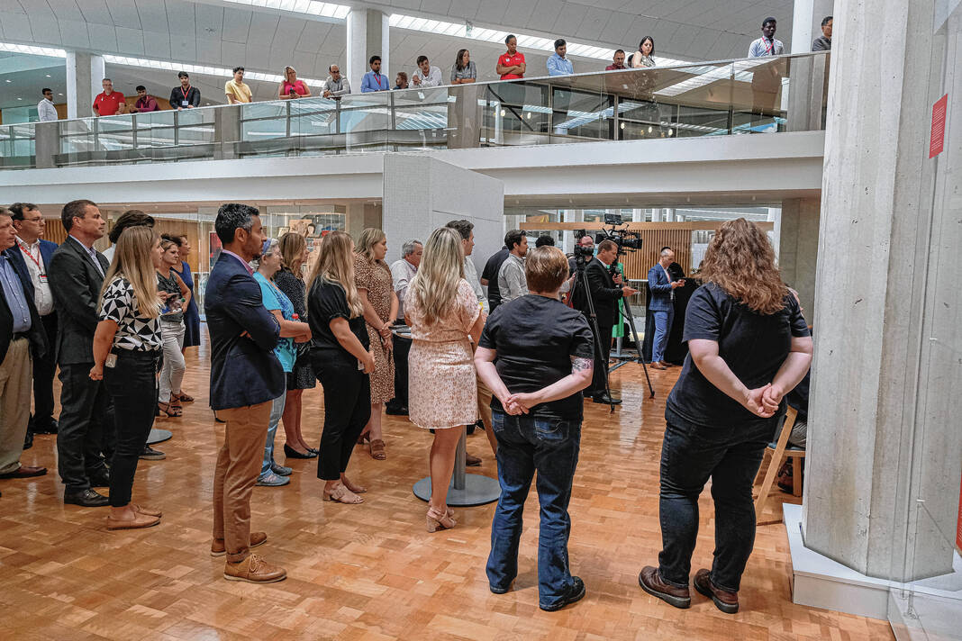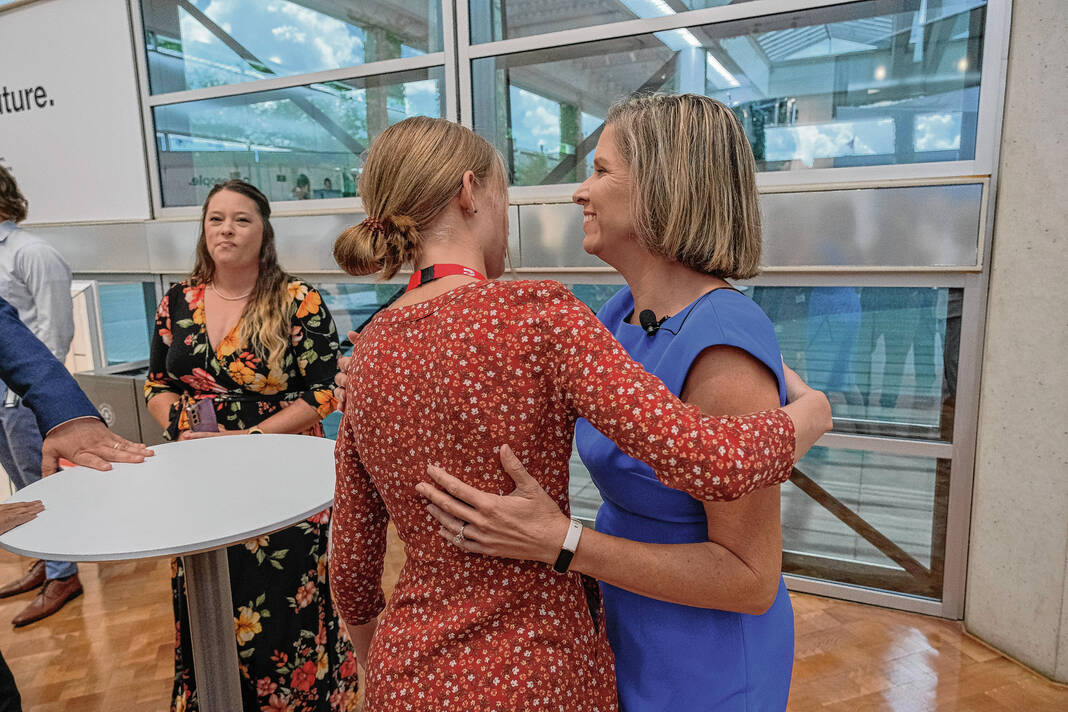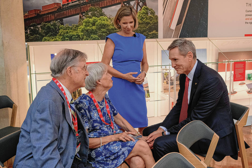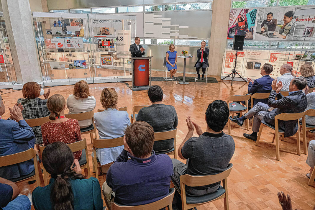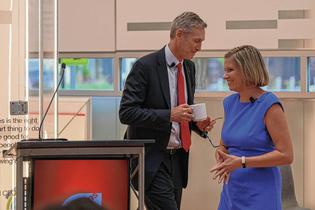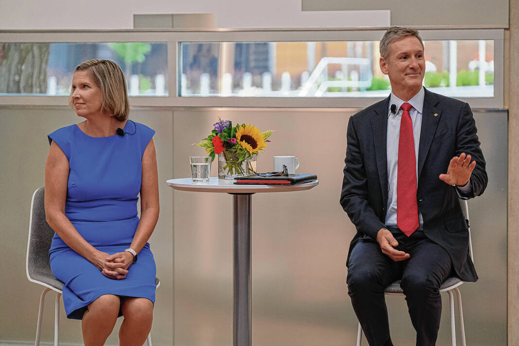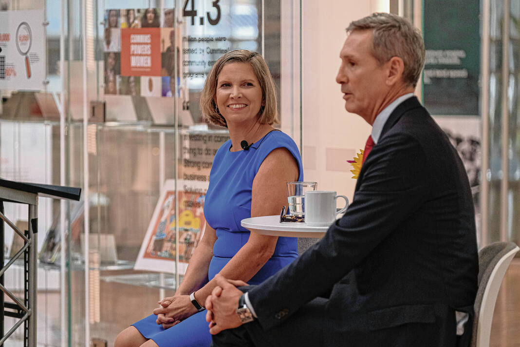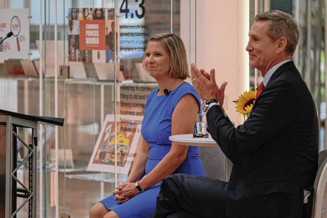 Mike Wolanin | The Republic Incoming Cummins President and CEO Jennifer Rumsey, left, and Cummins Chairman and CEO Tom Linebarger answer questions during a press conference at the Cummins Corporate Office Building in Columbus, Ind., Thursday, July 14, 2022. Rumsey is the first woman CEO since the company was founded over 100 years ago.