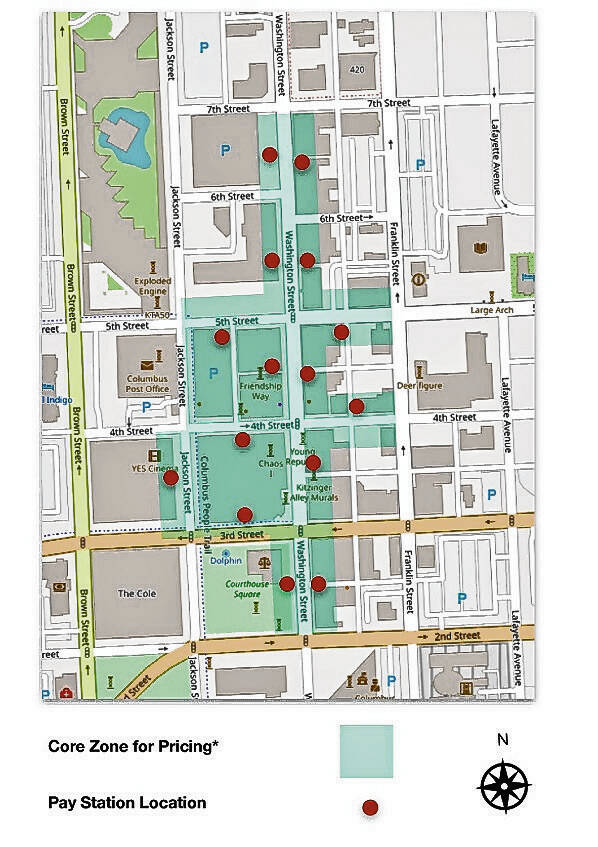 Photo provided This Columbus Parking Commission graphic shows zones for paid parking in downtown Columbus and where automated parking payment stations would be located.