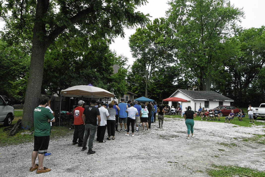 People line up for Salvadorian food during a fundraiser Saturday in Indianapolis for the funerals of Pedro Pineda, 56, and his wife, 37-year-old Rosa Mirian Rivera de Pineda, both of whom were killed during a mass shooting at the Greenwood Park Mall July 17.