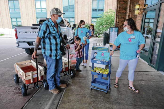 Mike Wolanin | The Republic Emma Grace Foundation members Brittney Melton, from left, Jenna Ortega, her children Jett and Eliza, Linsey Sweet and Bryan O’Neal pose for a photo with items donated by the foundation at Columbus Regional Hospital in Columbus, Ind., Wednesday, Aug. 10, 2022. The Emma Grace Foundation was started in honor of the late Emma Sweet.