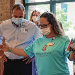 Mike Wolanin | The Republic Emma Sweet’s mom Linsey, right, talks with Columbus Regional Health Vice President and Chief Financial Officer Grant Byers about the items donated by the Emma Grace Foundation to Columbus Regional Hospital in Columbus, Ind., Wednesday, Aug. 10, 2022. The Emma Grace Foundation was started in honor of the late Emma Sweet.