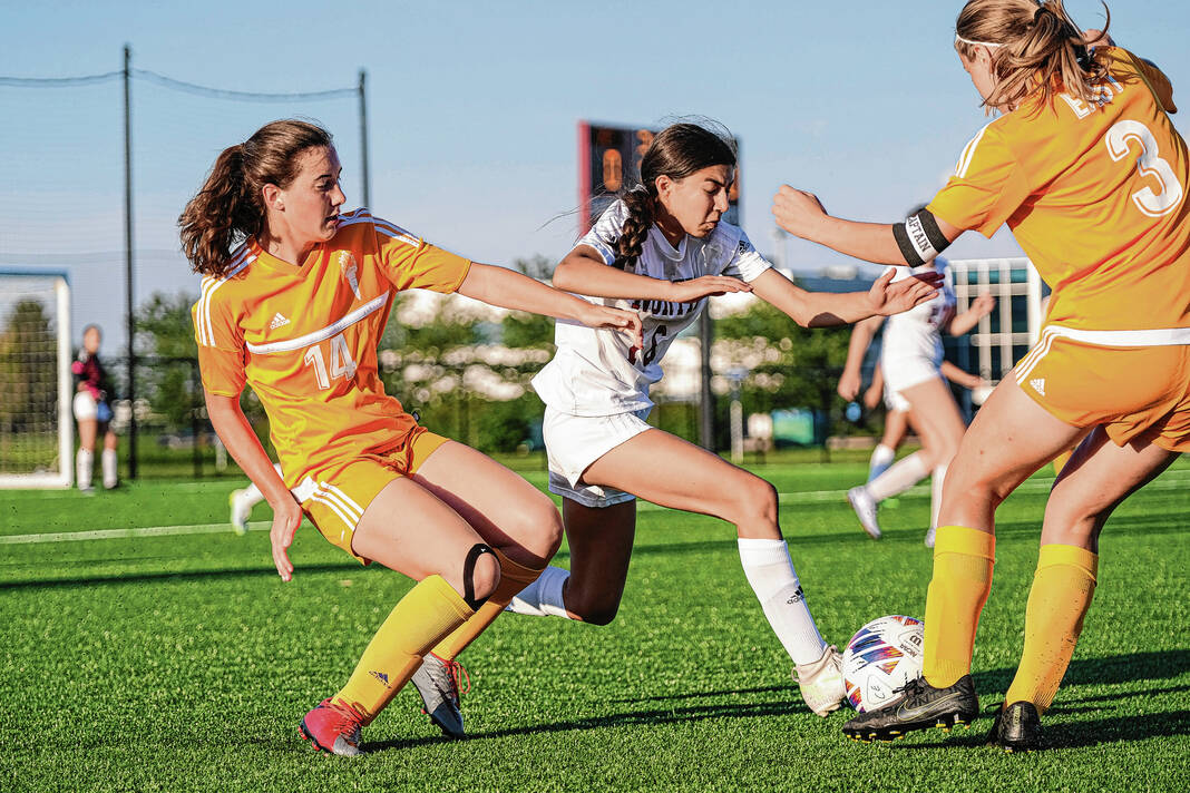 Columbus East’s Maggie Mathews, left, and Allison Craig, right, combine to take the ball from Bloomington North’s Erica Urheim, center, during a soccer match at the BCSC Soccer Complex in Columbus, Ind., Wednesday, Aug. 17, 2022.