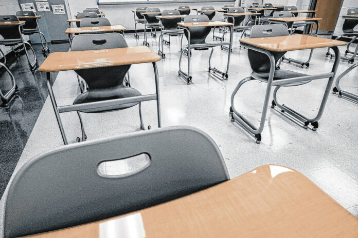 Mike Wolanin | The Republic Desks are shown in Katy Hubbard’s classroom at Columbus North High School in Columbus, Ind., Tuesday, July 28, 2020.
