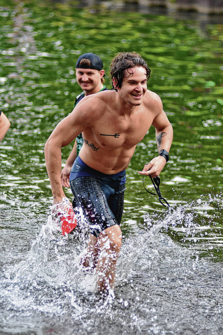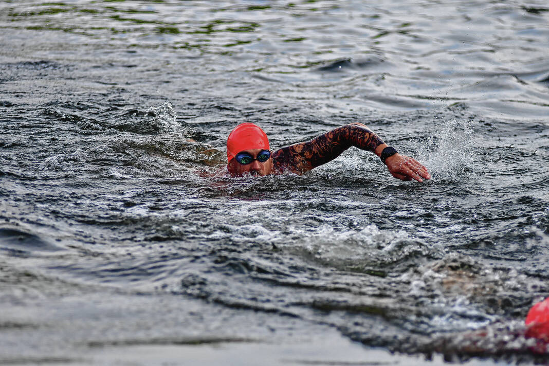 Thanks to the quick thinking of three heroes, a near-tragedy at the beginning of the event was averted. One of the later swimmers to start got about 10 meters into the water when he began flailing his arms trying to stay afloat.