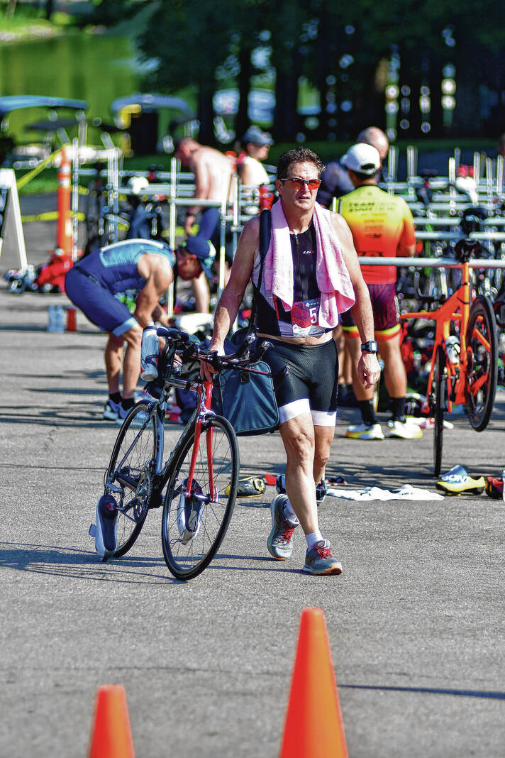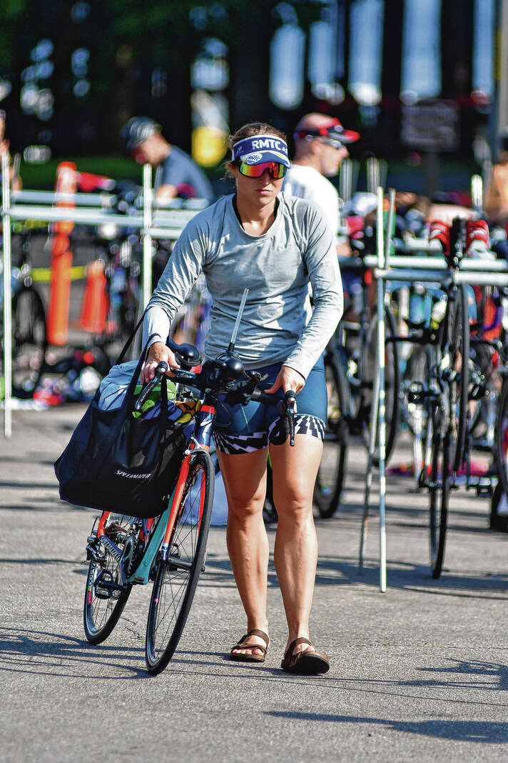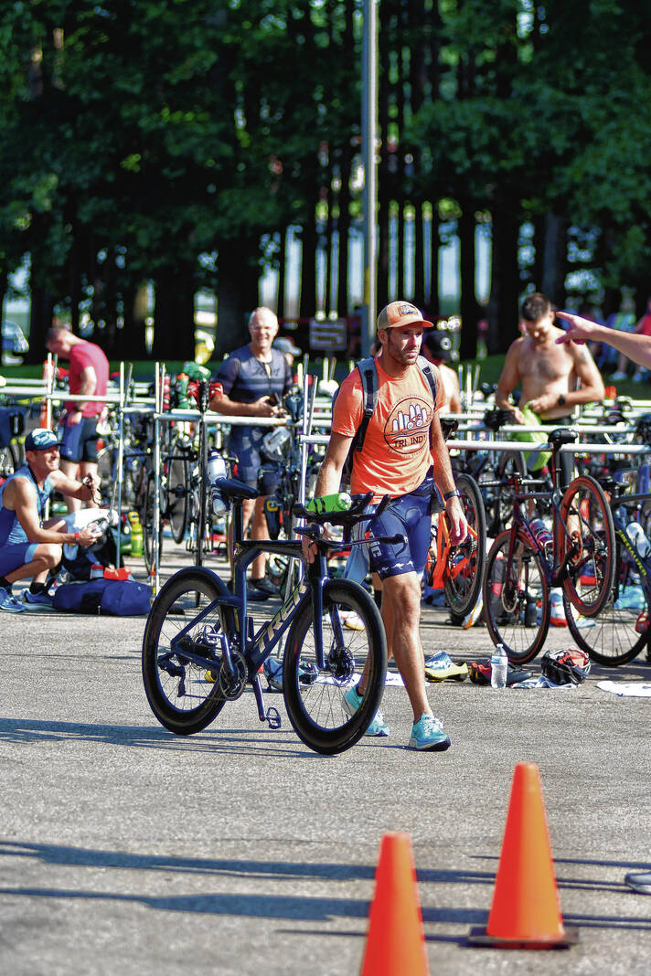 Triathletes prepare in the transition area for Saturday’s Tri-Columbus Triathlon at Tipton Lakes Marina in Columbus.