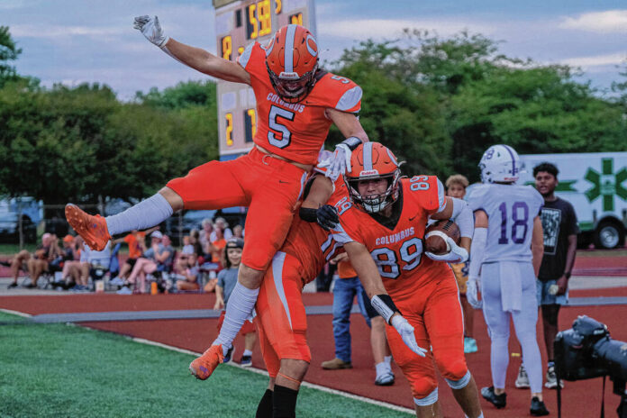 Columbus East’s Chase Zapfe, from left, and Nico Alvarez celebrate with Jared Brooks after Brooks caught a touchdown during a football game against Seymour at Columbus East High School in Columbus, Ind., Friday, Sept. 2, 2022.