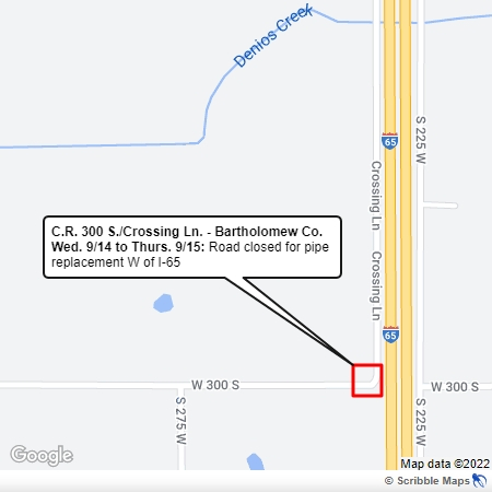 BARTHOLOMEW COUNTY — Indiana Department of Transportation contractor Force Construction plans to replace a pipe on County Road 300S/Crossing Lane as part of the I-65 added travel lanes project in Bartholomew County. The pipe is located at the intersection of the two roads, west of the interstate.