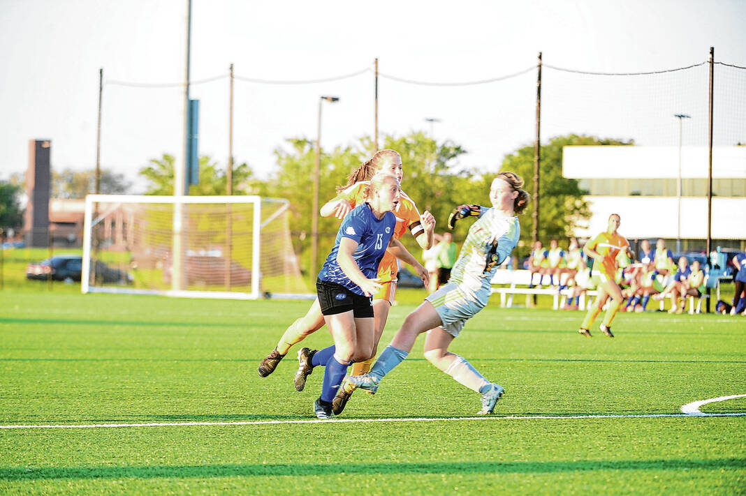 Columbus North’s Maddi Rutan (13) and Columbus East’s Allison Craig (3) battle for the ball ahead of East’s goalkeeper Kate Stiles during a match at BCSC Soccer Complex in Columbus.
