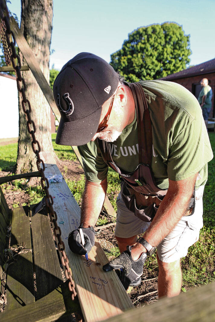 Carla Clark | For The Republic Rex Farrar adds his signature to the board with the names of the volunteers who worked on the 10th ramp for the Ramp It Up for United Way program, Friday, September 9, 2022.
