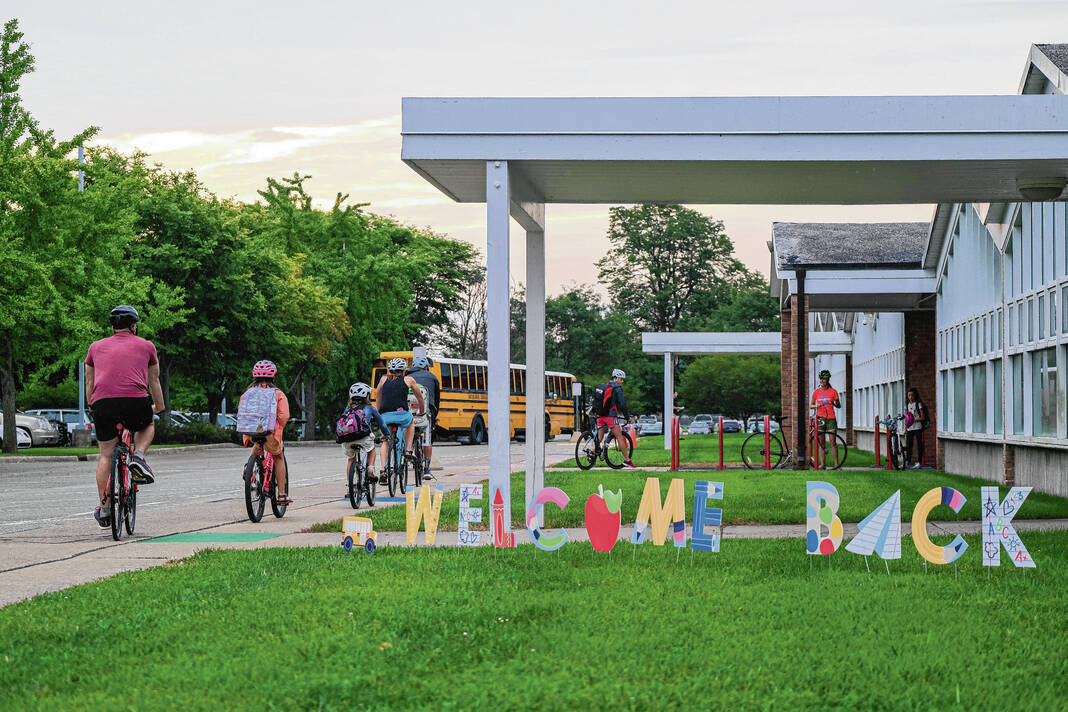 Mike Wolanin | The Republic A welcome back sign is positioned to greet students on the first day of school at Schmitt Elementary School in Columbus, Ind., Thursday, Aug. 4, 2022.