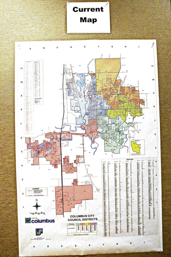 Another consideration is that state law requires that each district’s population should be within 10% of the number that represents the city’s population divided by its number of districts, said Dell. According to data provided by Miller, the recent census puts Columbus’s population at 50,224, which puts the district average at 10,045 when there are five districts and 8,371 when there are six.