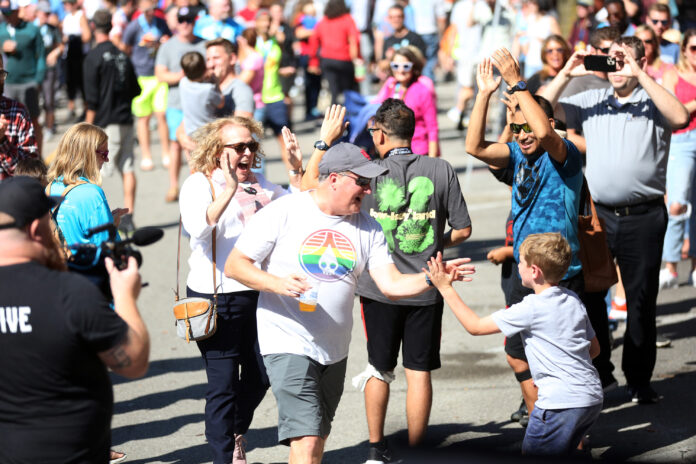 Cindy Frey reacts as Eric Frey gets a high-five after winning the truck during the Mill Race Marathon in Columbus, Ind., September 24, 2022. Carla Clark | For The Republic