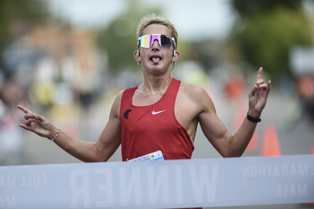 Will Cadwell, of Covington, Kentucky, celebrates as he wins the men’s division of the division of the Mill Race Marathon in Columbus, Ind., Saturday, Sept. 24, 2022.
