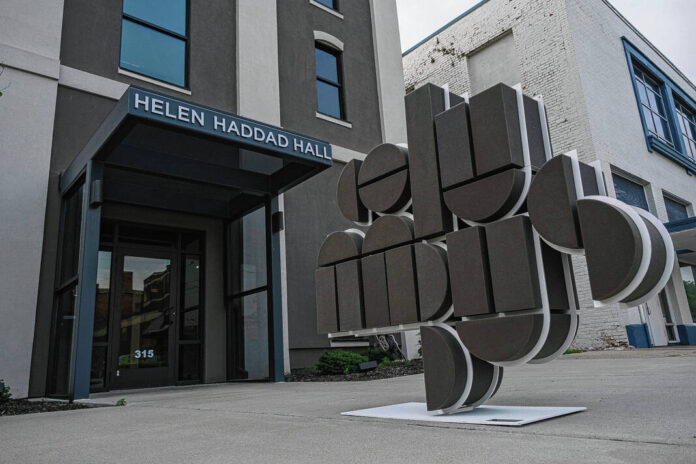 Mike Wolanin | The Republic Exhibit Columbus signage is on display outside Helen Haddad Hall for the Exhibit Columbus Community Kickoff event in Columbus, Ind., Tuesday, June 14, 2022.