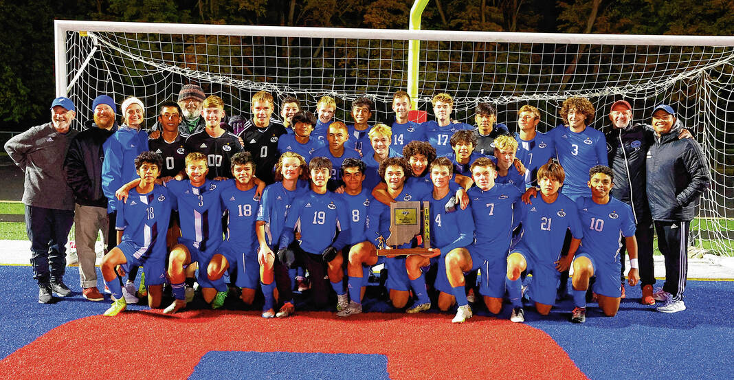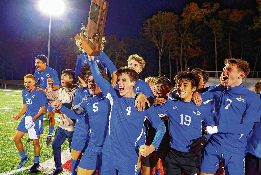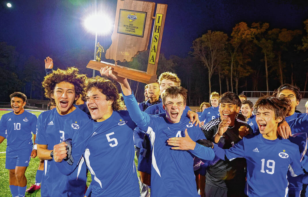 Columbus North's Anthony Johnson (5), Flynn Keele (4) and the rest of the team celebrates with the championship trophy after winning 3-1 against Franklin at the Roncalli Sectional final on Saturday October 8,2022.
