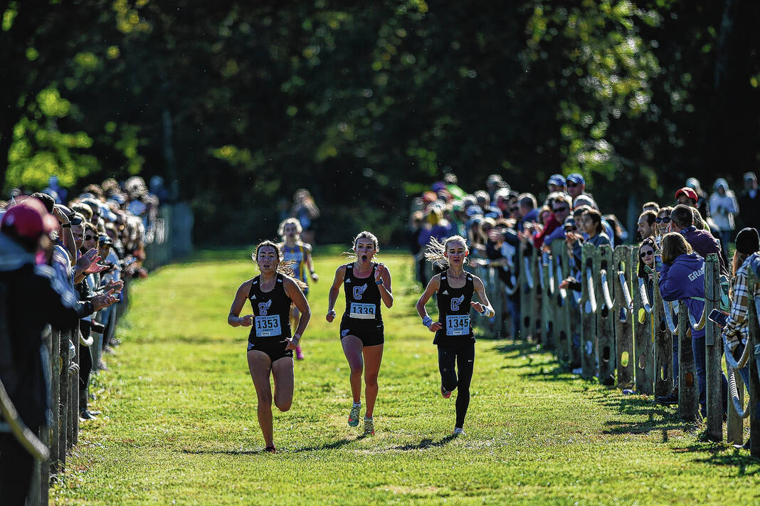 Columbus North’s Brianna Newell (1353), Lily Baker (1339) and Julia Kiesler lead the girls cross country sectional at Eagle Park in Brown County in Nashville, Ind., Saturday, Oct. 8, 2022.