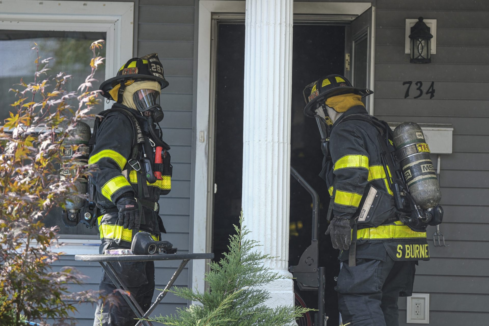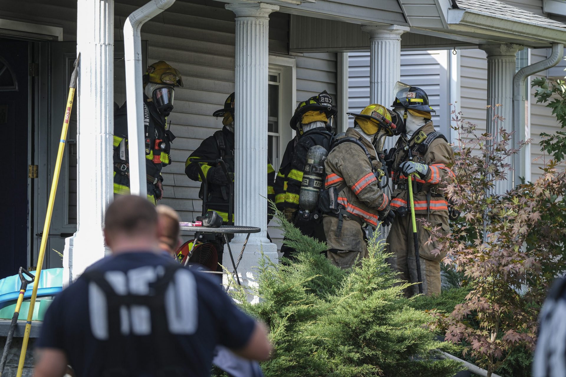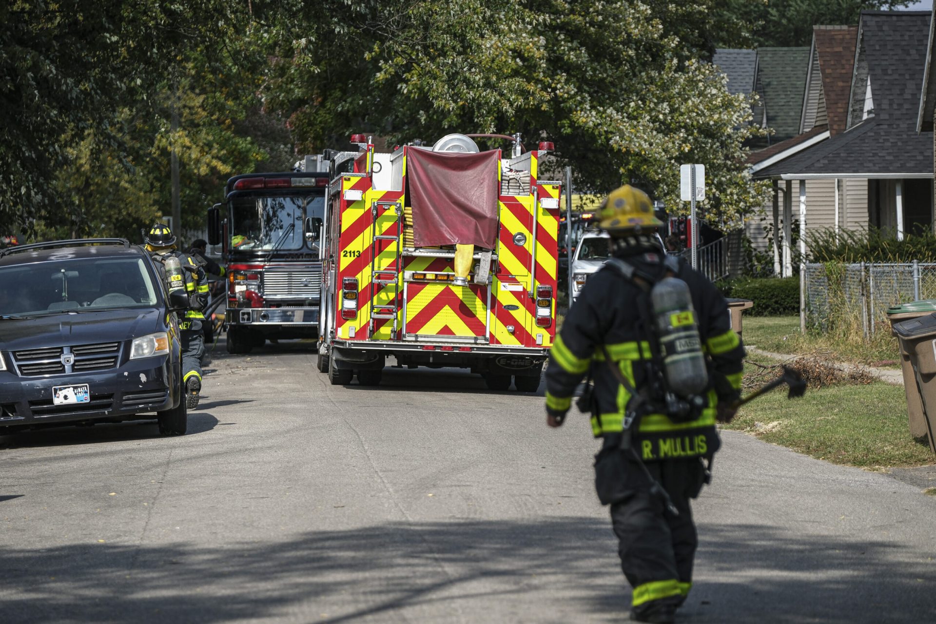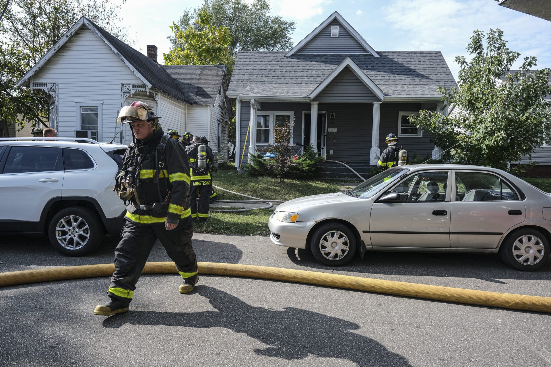 Columbus firefighter Daniel Pinnow removes some of his turnout gear as he takes a break from working a house fire on Reed Street in Columbus, Ind., Tuesday, Oct.11, 2022.