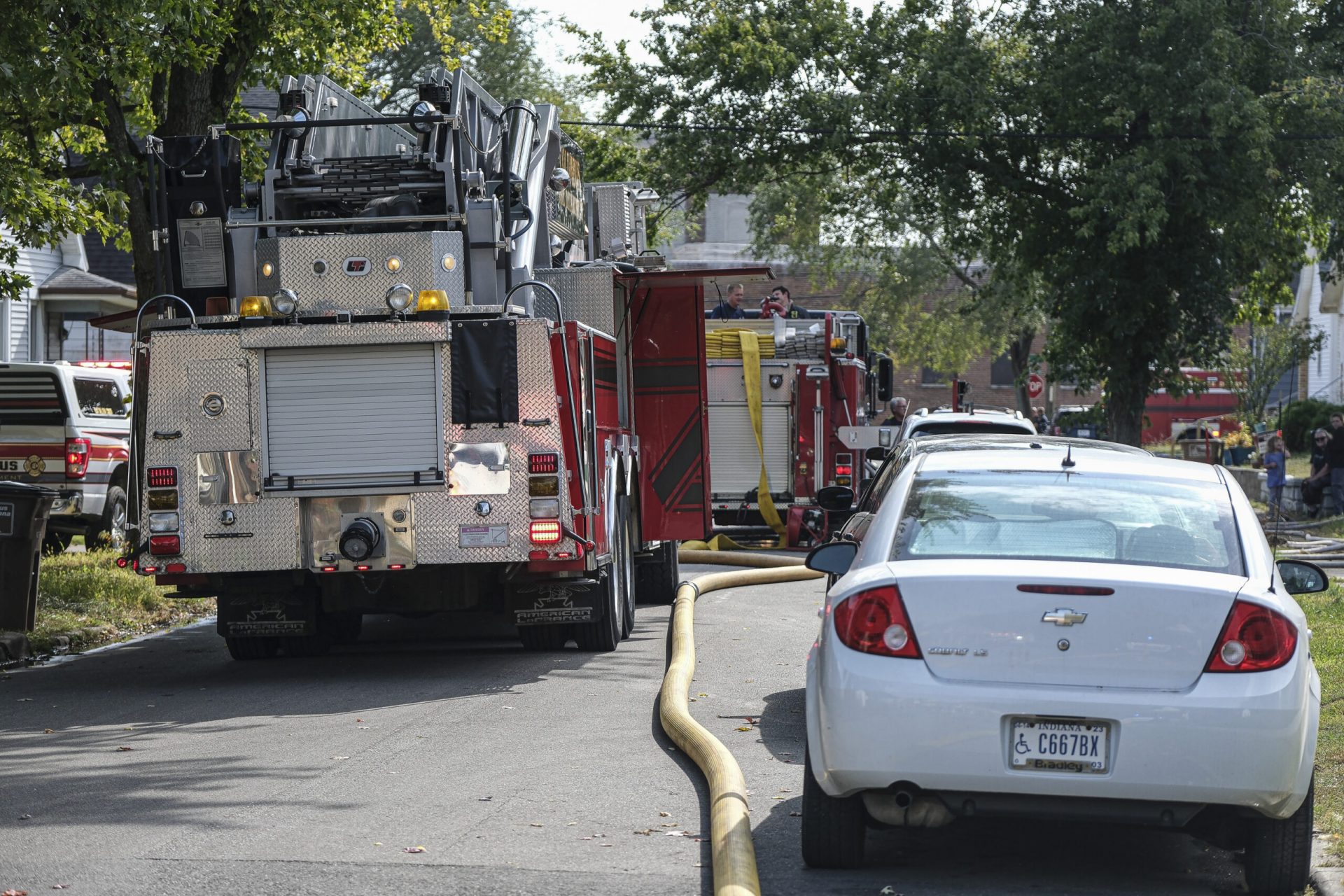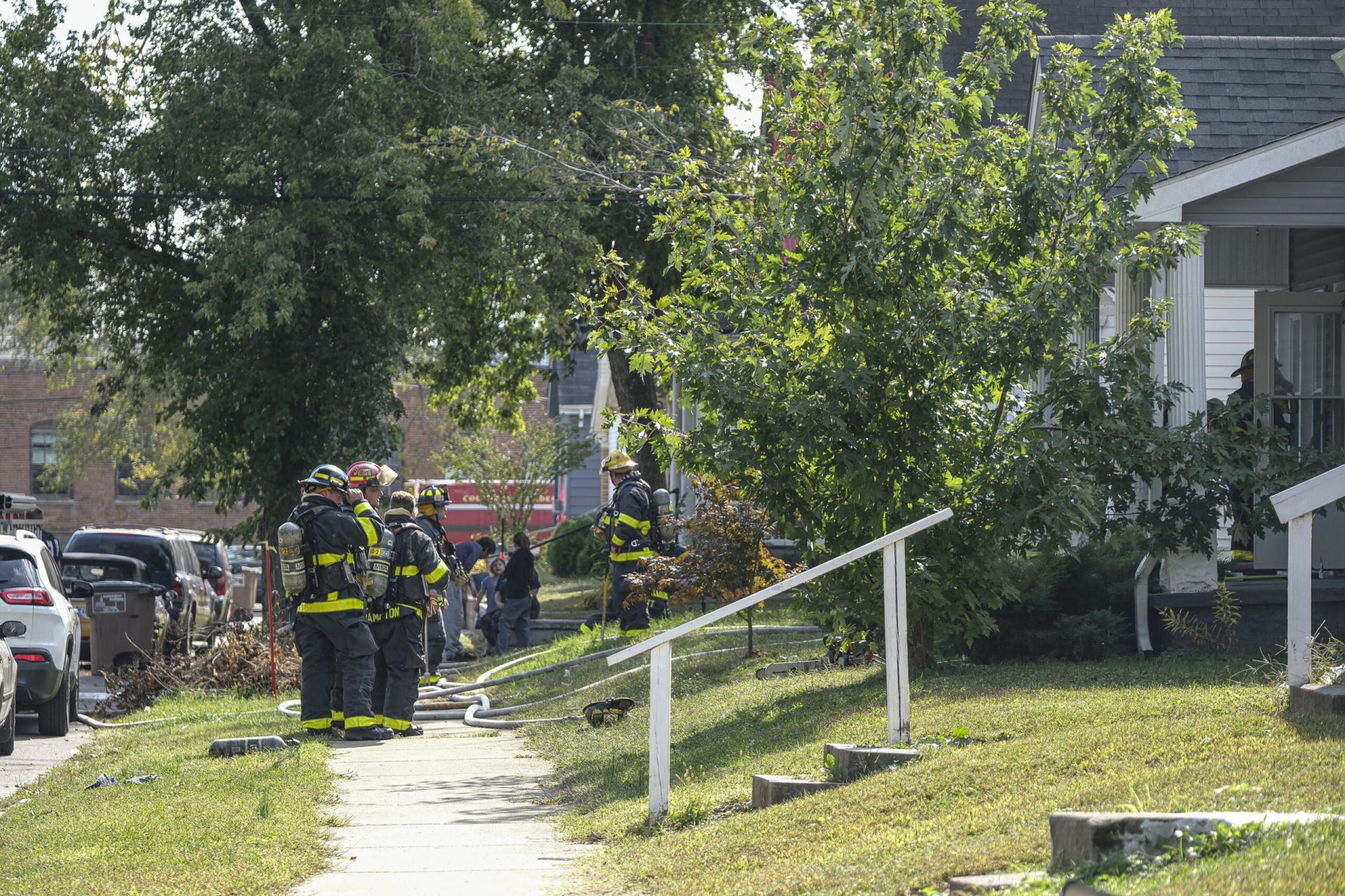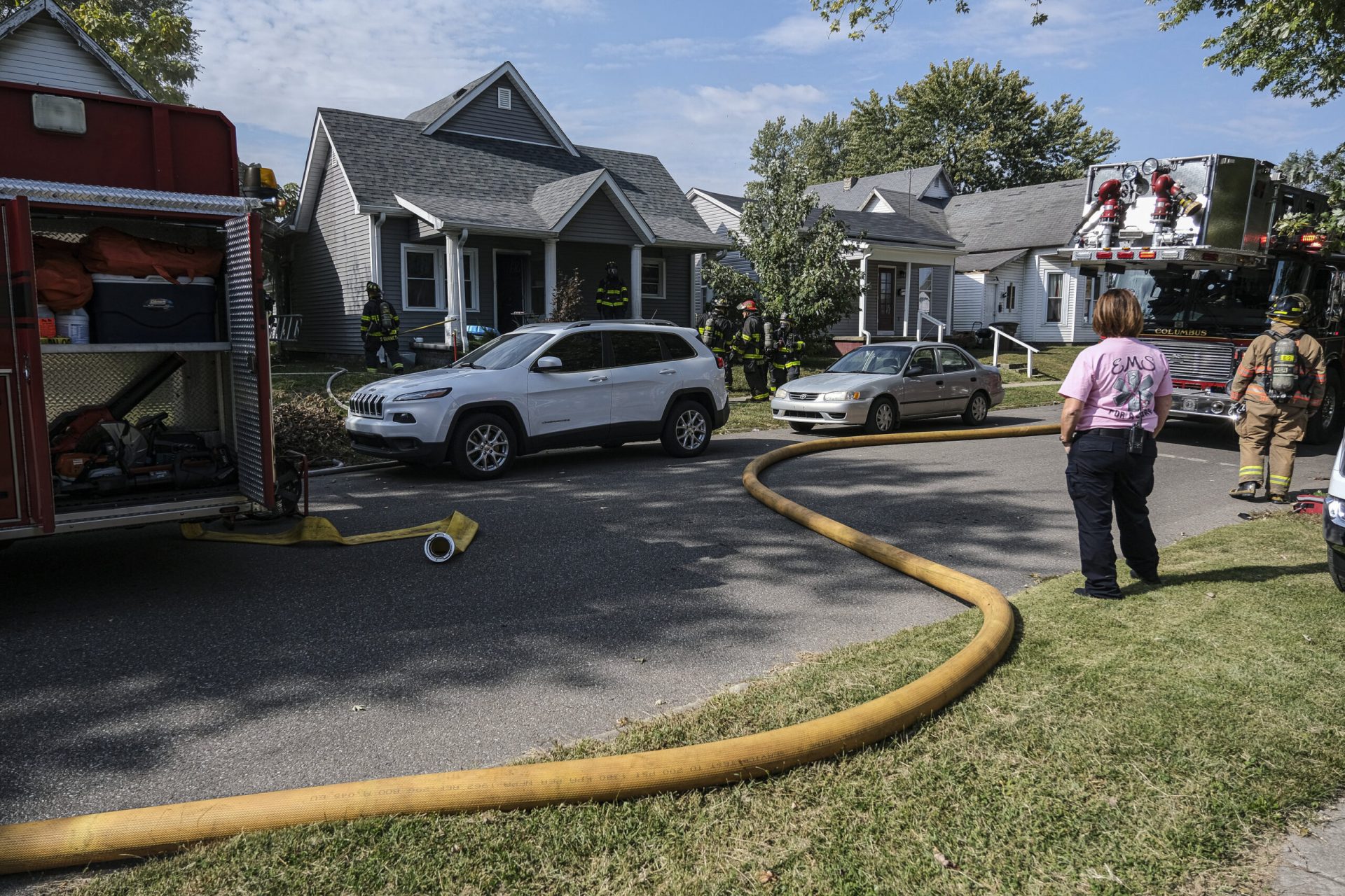 Columbus firefighters work a house fire on Reed Street in Columbus, Ind., Tuesday, Oct.11, 2022.