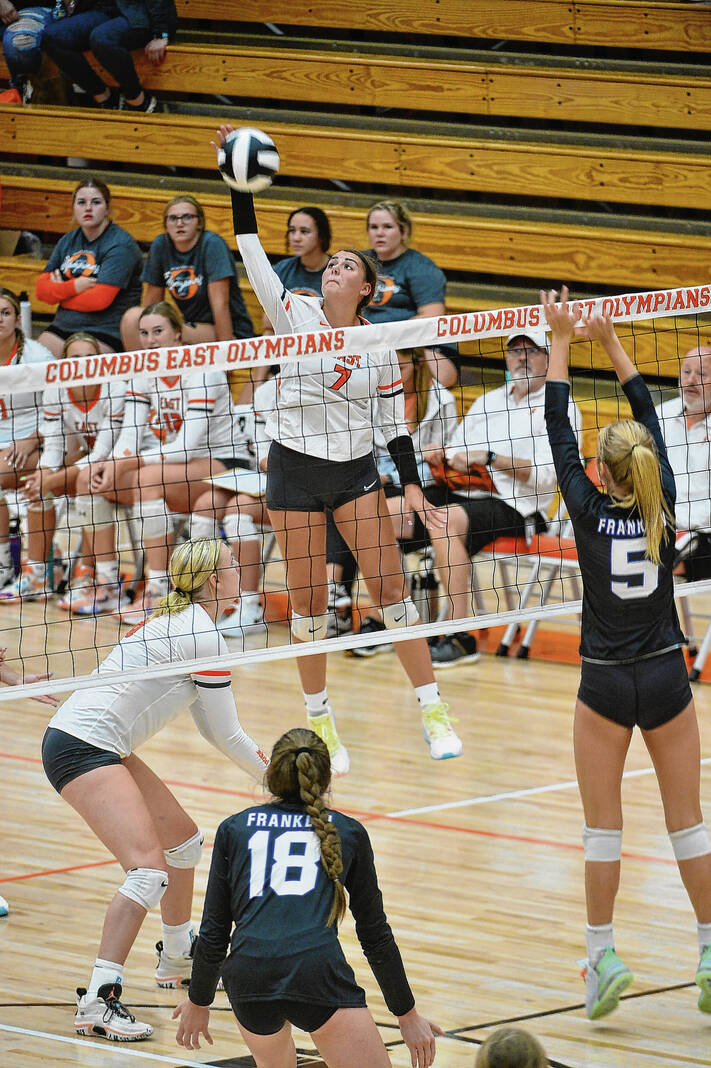 Columbus East’s Maddie Cline tips the ball against Franklin’s Veronica Whitaker Thursday, Aug. 18, 2022 at Columbus East High School.