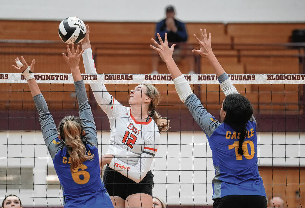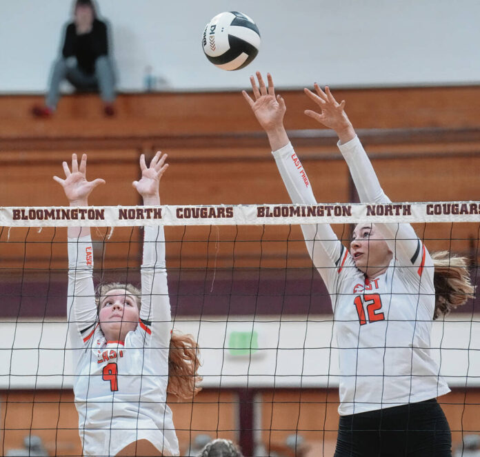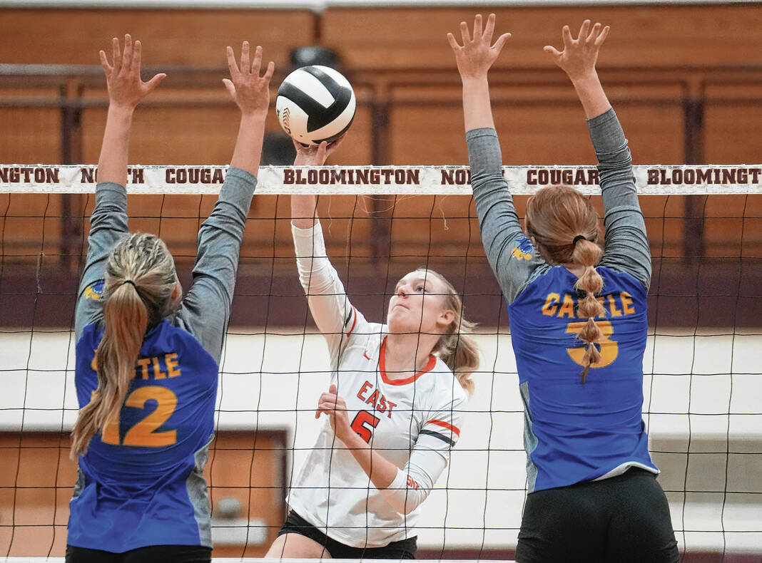 Columbus East’s Erin Williams, left, and Gabby Dean go up for a block during Saturday’s regional semifinal against Castle at Bloomington North.