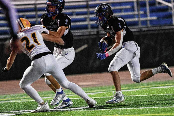 Columbus North’s Tyler Blythe (1) picks up a block from teammate Cooper Horn against Bloomington North’s Will Breedlove on his way to score a touchdown during a football game at Columbus North High School in Columbus, Ind., Friday, Oct. 7, 2022.