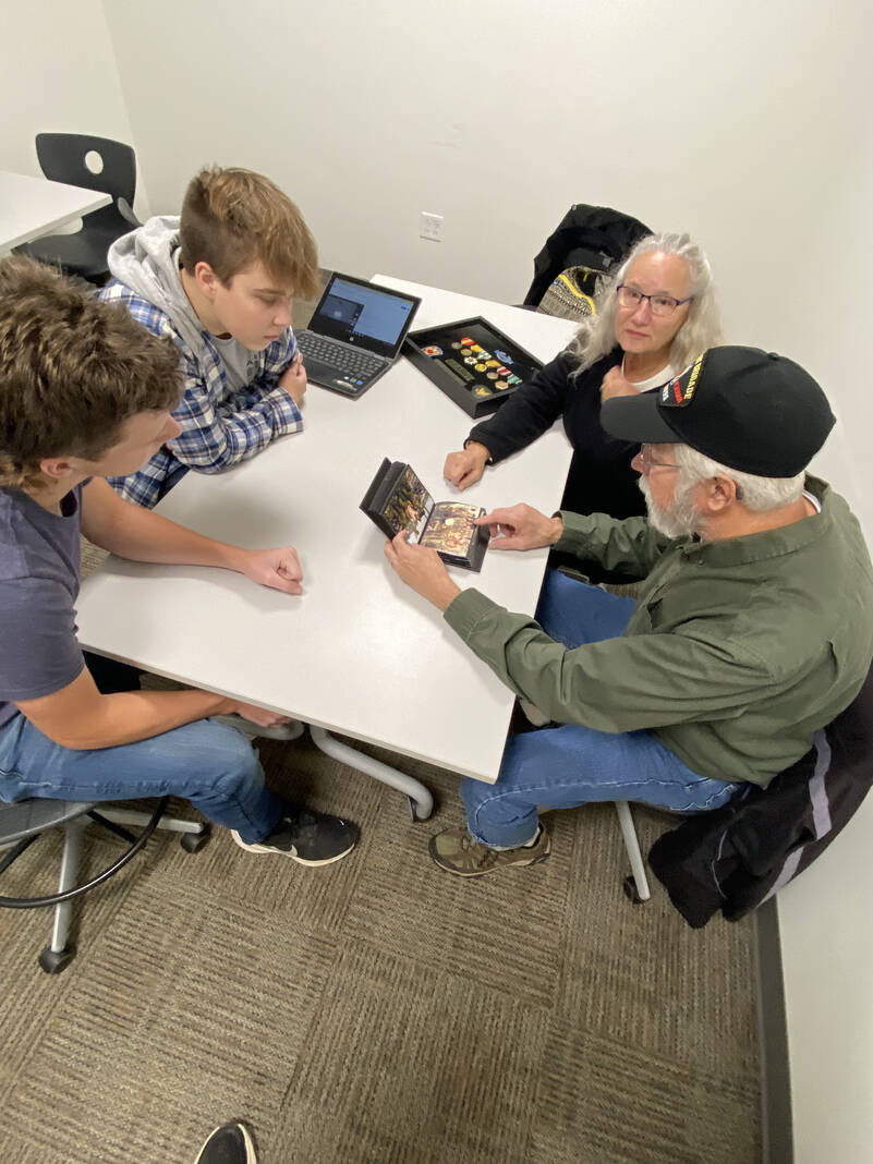 CSA New Tech students Asher Lamb and Spencer Campbell, left, along with Lois Steele, listen as veteran Rodney Steele discusses his service.