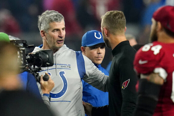 Indianapolis Colts head coach Frank Reich, left, greets Arizona Cardinals head coach Kliff Kingsbury after an NFL football game, Saturday, Dec. 25, 2021, in Glendale, Ariz. | AP Photo