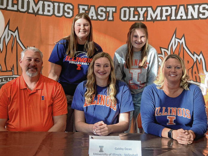 Columbus East senior Gabby Dean, front center, signed Wednesday to play volleyball at Illinois. She is joined by her parents Andy and Michelle Dean and, in back, sisters Hannah and Addyson Dean.