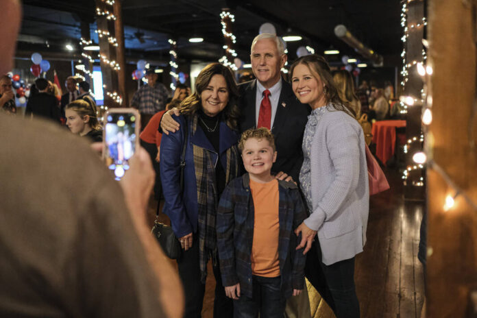 Mike Wolanin | The Republic Former Vice President Mike Pence and former second lady Karen Pence pose for a photo with Laura McLinn and her son Jordan during the Bartholomew County GOP election results watch party at Factor 12 Event Loft in Columbus, Ind., Tuesday, Nov. 8, 2022.