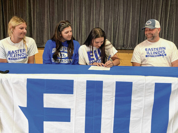 Hauser senior Hannah Taylor, second from right, signed Wednesday to play softball at Eastern Illinois. She is joined by her sister Katie Taylor, left, mother Amee Kidd and father Brian Taylor.