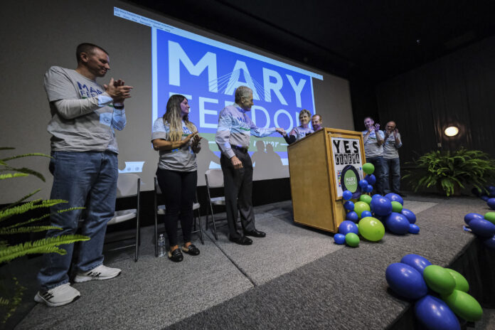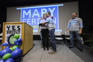 Mary Ferdon hugs her son Sam after announcing her candidacy for mayor of Columbus at Yes Cinema in Columbus, Ind., Saturday, Nov. 12, 2022.