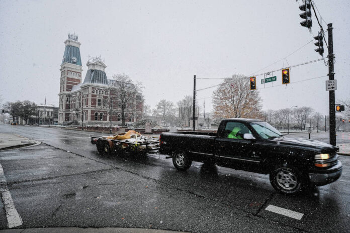 A dusting of about an inch of light snow covered Columbus and Bartholomew County on Saturday, leading to pretty scenes in neighborhoods but some slick spots on the roads.
