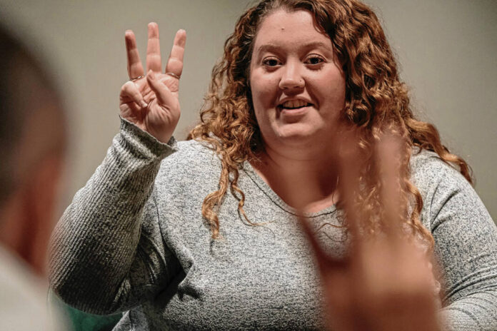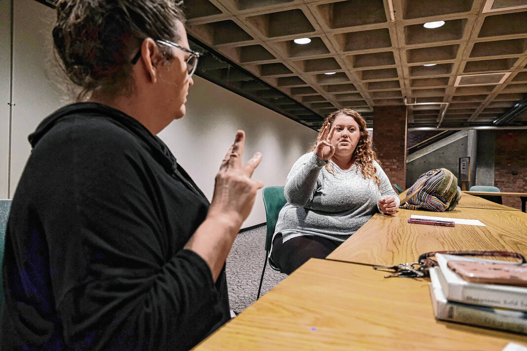 Mike Wolanin | The Republic Aeriel Haney practices signing numbers during an American Sign Language class at the Bartholomew County Public Library in Columbus, Ind., Thursday, Oct. 27, 2022.
